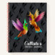 AI generated artwork of colourful, pastel-hued crested hummingbirds in flight on a subdued grey floral accented background. Great for journalling nature!