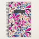 Watercolor cutout inspired blue peach black and purple floral leaves pattern. Personalize name inside grey rectangle at front.