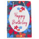 Orange, red, and blue daisy flowers on blue jean denim for general birthday.