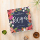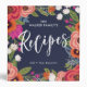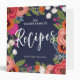 Floral recipe binder printed with a frame of hand-drawn flowers in orange, coral red, hot pink, and white. Add your name in white letters against dark blue. Recipes is written across the floral recipe book in a charming white brush script.