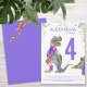 This vibrant and playful girls dinosaur party invitation features a colourful, psychedelic T-Rex alongside an adorable stegosaurus in rainbow colours, perfectly designed for a 4th birthday party that will thrill any dinosaur lover. Personalize this unique design by adding the birthday girl's name, age, and all the party details to create a one-of-a-kind invite. The purple-themed, prehistoric design brings the Jurassic era to life with original illustrations by artist Catherine Sweetman, capturing the fun and excitement of the Jurassic dino world. Whether it's Tyrannosaurus rex, Stegosauruses, or any other dinosaur species, this invitation sets the stage for a roaring good time at a dinosaur-themed birthday celebration.