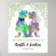 Welcome you guests with this fun colourful psychedelic dinosaur themed wedding welcome poster sign with funny dinosaur bride and groom and watercolor eucalyptus greenery. If you and your partner love dinosaurs this is the perfect way to bring some roarsome dino love to your special day. Unique T-Rex watercolor illustrations in blue pink purple yellow orange and green hues. Easy to use templates with modern whimsical typography script. Original artwork by artist Catherine Sweetman