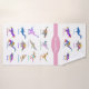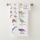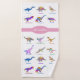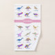Dinosaur personalized pink colourful bedroom en suite decor with 12 Dinosaurs in psychedelic bright colours with their dino names on a white background. This fun colourful pattern includes all the prehistoric jurassic era favourites including T. rex or tyrannosaurus, velociraptors, brachiosaurus, brontosaurus, stegosaurus, the flying pterodactyl, triceratops, spinosaurus, ankylosaurus, plesiosaurs, parasaurolophus and pachycephalosaurus a fun spelling challenge for any child. Add a Childs name to create the perfect personalized palaeontology educational bathroom or bedroom en-suite decor for the girl who loves dinosaurs in pink colour theme. Original artwork by artist Catherine Sweetman