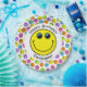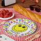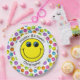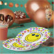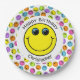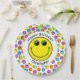 A yellow face sits in the centre of this plate with sample text "Happy Birthday" above and the name "Christopher" below for you to personalize. Background is a white circle with a border of colourful faces in pink, orange, yellow, green, blue and purple. Great for birthday parties or other special occasion.
