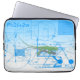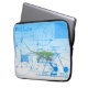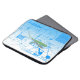 A fun and colourful custom laptop sleeve that has an illustration of a green lizard standing on a paper filled with mathematical equations and geometric designs. Beautiful blue background.