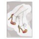 Fun, retro style illustration of female legs with cute, multicolor striped high heeled shoes on a grey background. Girly, trendy abstract design for fashion lovers.