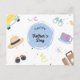 This Father's Day Holiday Postcard offers a colourful and cheerful design that celebrates the diverse interests and hobbies of dads everywhere. The front of the card is adorned with playful illustrations that include a classic car, a stylish fedora, a pair of sunglasses, a cozy teacup, and a travel suitcase, all set against a backdrop of confetti and streamers. The central focus is a blue circle with "Happy Father's Day" elegantly scripted inside. This design captures the essence of Father's Day — a celebration of all the things that make dads special and loved. To add a personal touch, the back of the card is customizable, allowing you to write a heartfelt, personalizable message that will make your dad feel truly celebrated on his special day.