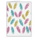 Feathers pattern in teal, magenta, golden yellow on white background.