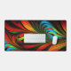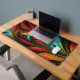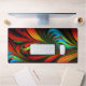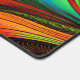 A feathery, fractal image in blue, green, orange, red, and yellow creates a beautiful desk mat.