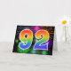 The front of this exciting, fun, and vibrant greeting card design features a colourful pattern inspired by celebratory fireworks, along with the number "92" having a multicolored rainbow like gradient pattern, on a black coloured background. The inside features a personalized greeting message, or could perhaps be cleared and left blank if a message is to be written by hand instead. A greeting card like this could be a fun, happy way of sending a greeting message to somebody who is celebrating their ninety second birthday, or perhaps to a couple celebrating their ninety second wedding anniversary, or to somebody celebrating some other 92nd event. [~Z0000342]