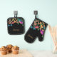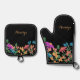 Colourful Floral Custom Script Name on Black Oven Mitt & Pot Holder Set