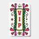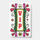 Fun party accessory badge, with colourful doodle art of a floral frame and bold red text reading VIP. Great for birthday parties, bachelorette parties, Sweet 16 and more.