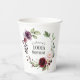 Custom paper cups to celebrate a milestone birthday, this feminine floral design features garden roses in bright watercolor hues of red, plum purple, and blush pink with lush greenery. The text template may be personalized with the guest of honour's name and age. Shown here as a 100th birthday, you can edit the age to any age.