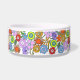 Pretty dog dish done in white ceramic, with graphics of a field of colourful flowers around the bowl. The front of the pet dish has a round pink text area, with black text ready to personalize for your pet.