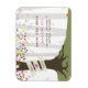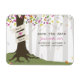 A wedding save the date magnet featuring an illustration of a tree in the forest. Tree has pink, yellow, purple, orange and green leaves, exposed roots, and a trunk wrapped with banner that can be customized with bride & groom's names. Look for matching wedding invitations and more at Jill's Paperie.