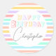 This customizable round colourful fun stripe Happy Birthday sticker features a vibrant pastel striped border and playful rainbow lettering, making it the perfect happy birthday sticker, personalized birthday sticker, or custom name birthday sticker for party favours, gift bags, invitations, or envelope seals. Easily personalize the elegant script with any name, and use this pastel birthday label as a rainbow birthday party favour, party bag sticker, birthday envelope seal, kids birthday sticker, gift tag sticker, or birthday celebration supply to create a memorable and uniquely tailored celebration.