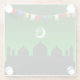 Colourful illustration with a festive garland in a magic night scene with a mosque silhouette and the moon and stars on a green night sky.