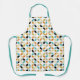 This funky colourful mid century modern apron features a turquoise blue, orange, gold, tan, and black abstract circles pattern with a matching turquoise strap. This will liven up your cooking or baking!