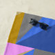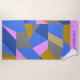 This fun geometric abstraction beach towel features colourful geometrical shapes in a bold colour palette of blue, pink, and gold, personalized with your name.