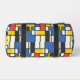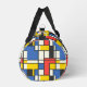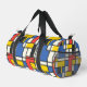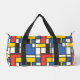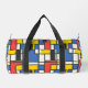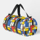 An abstract, geometric, and brightly coloured print in blue, yellow, red, and black squares, rectangles and lines creates a duffel bag that you will love to carry anywhere!. Reminiscent of Piet Mondrian's style, this is a retro look with a modern update that's sure to please!