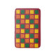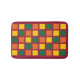Stylish colourful Bath Mat with geometric squares in yellow, green and orange, against a burgundy background. Modern addition to your bathroom decor.