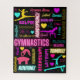 Colourful Girls Gymnastics Glossary Typography design that is loaded with bright colour, delightful fonts, gymnast silhouettes on floor, balance beam, vault and bars. Features many common gymnastics words every gymnast will be familiar with. Also includes tiny doodle hearts, flowers and other small details to keep this design bursting with delight all over!