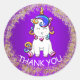 A cute unicorn thank you sticker that can be personalized, featuring a little unicorn surrounded by a circle of gold glitter, set against a shiny purple background. Ideal for thanking the guests for coming to a little girl's birthday party. Please note, the wording can be customized, or removed altogether if desired.