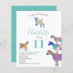 A collection of colourful, cute watercolor goat illustrations in vibrant pink, purple, blue, orange, yellow and aqua. A cute farm animals 11th birthday party invitation with baby goats and goats standing on goats. This fun budget birthday party invitation is easy to personalized to create a unique party invitation suitable for children and adult goat lovers. Colourful  psychedelic goat original illustrations by artist Catherine Sweetman