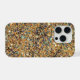 Glamourous golden glitter phone case with colourful glassy pieces sprinkled over black background.