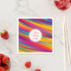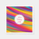 Colourful abstract image featuring bright red, purple, yellow, green, and blue shades. Personalized paper napkin perfect for birthday parties with custom text in round white frame.
