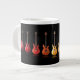 Cool mug for coffee, tea, milk, or juice with photograph of colourful guitars on a black background.
