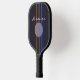 Add an individual touch to your pickleball game with this stylish guitar themed paddle, featuring a bold, modern design. The front showcases a guitar strings design in a rainbow of colours crossing over a circular soundhole graphic, set against a deep navy background. Personalize with your name in elegant script on the front, and your initial as a monogram on the back. Blending function and flair, it's an ideal gift for music lovers who play pickleball.