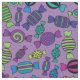 These colourful Halloween hard candies in purple, turquoise, black and green will make a sweet fabric for DIY Halloween projects. Background is purple with circles.