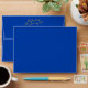A retro modern hand written bright colourful wedding envelope. Which features bold bride and groom's names in yellow with blue background. And personalized return address a. Which suits the whole wedding suite.