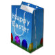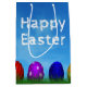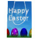 Happy Easter illustration featuring colourful painted Easter eggs in the grass with the blue sky in the back and "Happy Easter" typography written with white clouds.