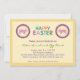 Sweet and colourful Easter invitation. Features two bunnies with a polka dots pattern inside a scalloped edge circle. In the centre the words Happy Easter are written in different spring colours. Ideal card to host a lunch, brunch, egg hunt or any other Easter gathering. Soft pastel colours typical of the Spring season. Add your own wording.