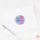 Colourful, personalized Happy Retirement classic round sticker with a unicorn rainbow colour background, gold glitter sparkles confetti, and black and white writing. You can easily add the name of your choice and change the colour and font of the name using the customize option!