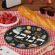 Colourful Hebrew Hanukkah Dreidel Menorah & Doughnuts  on dramatic black background. These colourful plates are the perfect way to set a festive Hanukkah/Chanukah Party table. Delight your guests...Whimsical colourful Chanukah elements — including Jelly Doughnuts, Dreidels, Wrapped Gifts, Gold Coins and Stars— surround the word CHANUKAH in Hebrew.  If you would like to see a different version of this design- email us at: bestdressedbread@gmail.com. We LOVE to Collaborate. Happy Chanukah!