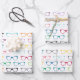 Whimsical colourful wrapping paper sheets with a hipster eye glasses pattern in shades of aqua, blue, red, purple, orange, yellow, lime green, grey and white.