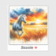 A graceful horse gallops through golden wheat fields, with a dramatic sunset illuminating the sky in vibrant hues of orange and blue. The background features distant barns and birds flying, creating a serene rural atmosphere.