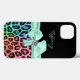 Fashionable iPhone case done in black, on the top and a colourful spotted jaguar print, on the bottom. Graphics of a mint ribbon and bow, with a diamond accent, decorates the middle, of the case. Personalize the mint coloured text for yourself or as a purrfect gift idea.