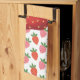 Kitchen towel with big juicy red strawberry on duo pattern fruit and polka dots background.