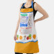 Colourful apron, with graphics of a cooking conversion chart, with oranges, a mushroom and colourful bell peppers, along the bottom. Great gift idea for any cook.