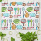 Kitchen / dining utensils and crockery doodles in colourful pattern.