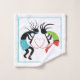 Colourful Kokopelli Love heart pattern shower curtain. It features two black Kokopelli figures one male an one female in red, green and blue clothes. The hand towel includes borders of the Kokopelli figures with double blue lines and your monogram while the washcloth has a Kokopelli pair in the centre with a blue border around.