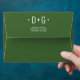 Colourful leaf print and initials moss green wedding envelope. The outside of the envelope is of green colour with your initials and address on the flap in white. The inside includes a colourful leaf print pattern. If you want an envelope liner you can delete the leaf print and use the one available in our "leaf print" collection.