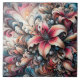 Vibrant lily flowers swirl within intricate, colourful fractal patterns, showcasing bold hues of pink, red, blue, and cream in a stunning floral composition.