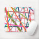 This mouse pad has a geometric design of scattered lines in floral colours – shades of pink, orange, yellow, blue, and green.