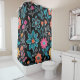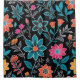 This seamless pattern features a variety of colourful flowers and leaves on a dark background. The flowers are in a variety of colours, including red, orange, yellow, pink, purple, and blue. The leaves are blue and grey.