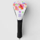 Pretty golf head cover done in white with graphics of colourful four-leaf clovers. Personalize the custom one letter monogram, for yourself or as a great gift idea for her.